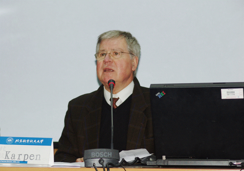 同日下午,德国汉堡大学公法与政治科学研究所著名公法学者、德国公法教授联合会会员乌尔里希·卡蓬(Ulrich Karpen)教授来公司进行学术访问。访问期间,龙卫球经理、主管外事的孙新强副经理、高全喜教授等在经理办公室与卡蓬教授及其夫人进行会谈,双方对于两院之间的公法研究之间的合作进行了讨论并且达成初步思路。此后,卡蓬教授以“如何实现善治”为题,担任校庆论坛“北航法学前沿讲座”第8讲主讲人,在如心楼中报告厅为w88win体育官网入口的公司做了一场演讲。讲座由w88win体育官网入口宪法与行政法研究中心副主任黄卉博士主持,中心主任高全喜教授担任评论人,毕洪海博士担任英文翻译和副评议人。讲座十分精彩,卡蓬教授的访问取得圆满成功。