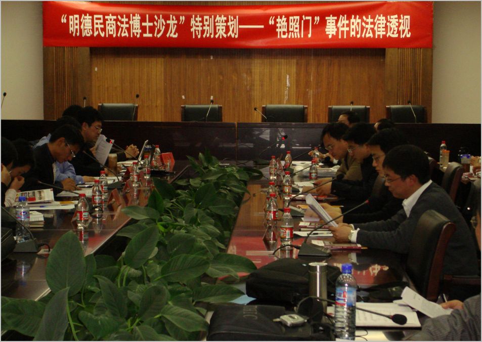 2008年2月28日18:30分,由中国人民大学民商事法律科学研究中心主办,明德民商法研习社承办的“明德民商法研习社博士沙龙”第十二期在中国人民大学明德法学楼601徐建国际报告厅举行,主题是“艳照门”事件的法律透视。