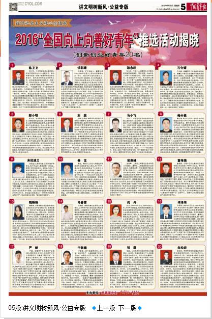 图为:《中国青年报》头版报道2016年“全国向上向善好青年”活动