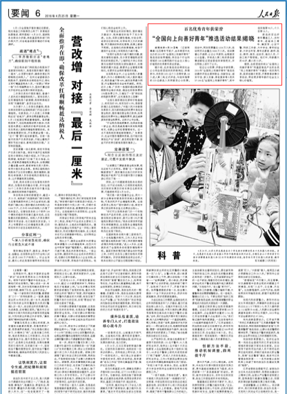 图为:《人民日报》要闻第6版报道2016年“全国向上向善好青年”活动