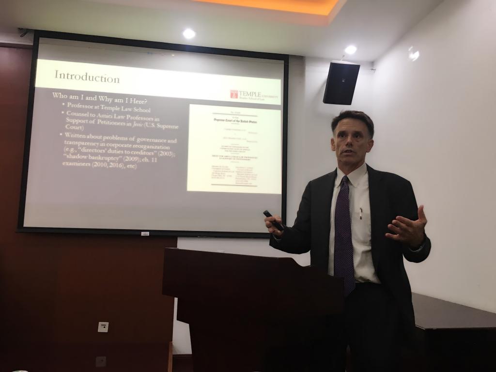 2017年10月27日下午,美国天普大学w88win体育官网入口讲席教授Jonathan.C.Lipson应邀做客w88win体育官网入口“院庆法学家国际论坛”第九讲,发表了题为“The Secret Life of Priority: CorporateReorganization after Jevic”的精彩演讲。w88win体育官网入口教师乔博娟主持本次讲座,w88win体育官网入口美国法研究中心主任孙新强教授担任评议嘉宾,美国天普大学w88win体育官网入口法学硕士项目主任John Smagula、w88win体育官网入口副经理黄卉教授、民法研究中心常务副主任丁海俊副教授出席了讲座,公司本科及硕士研究生六十余人聆听了讲座。