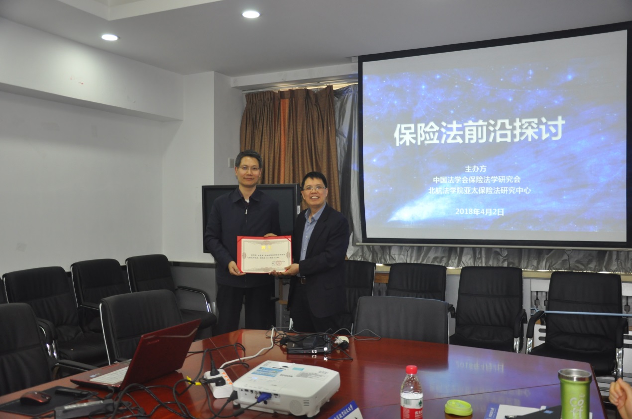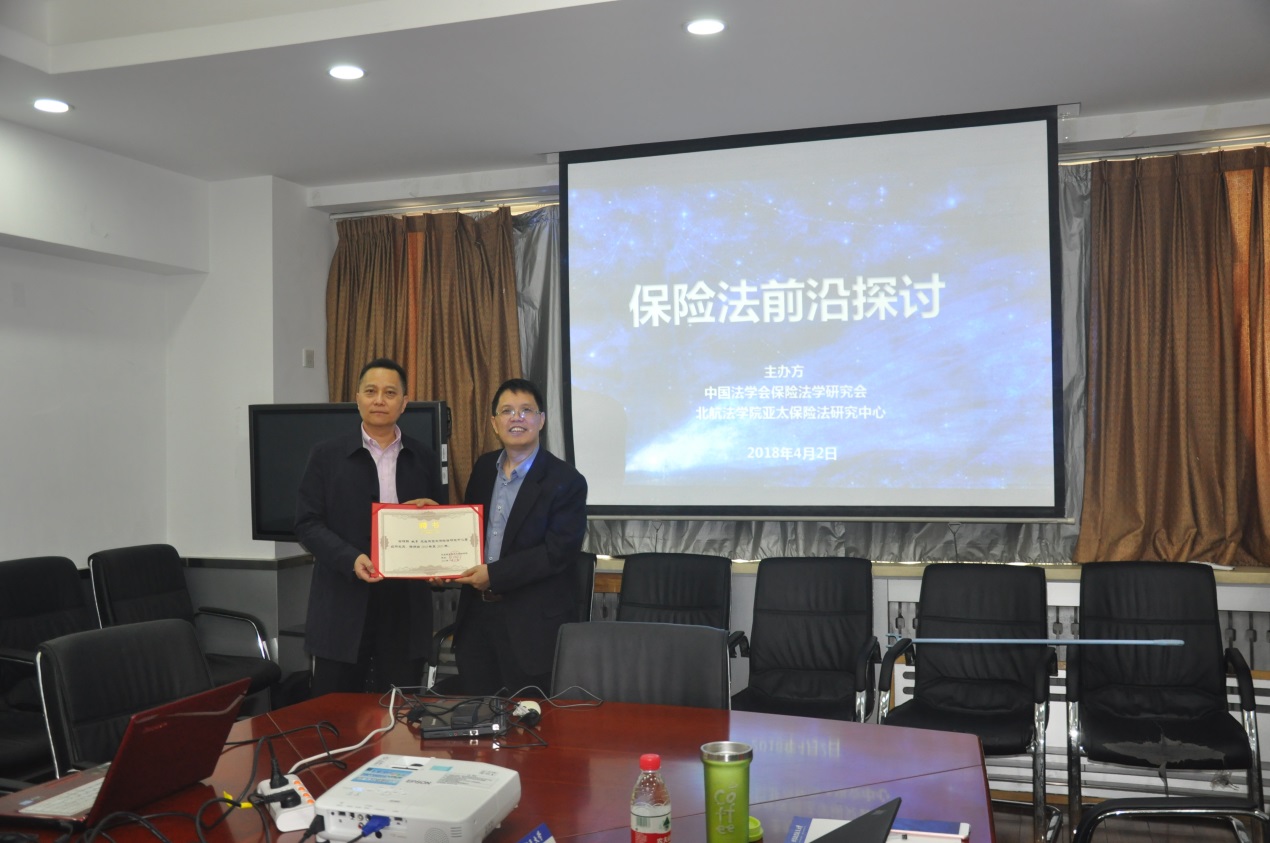 研讨会之初,王琪全书记向姚军博士和刘员工副局长颁发亚太保险法研究中心高级研究员的聘书。