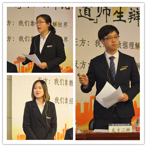 比赛中,教师代表队通过阐述数据对于理解世界的基础性作用,旁征博引、由浅入深,直把辩论当课堂,不时赢得在座同学们的阵阵掌声。