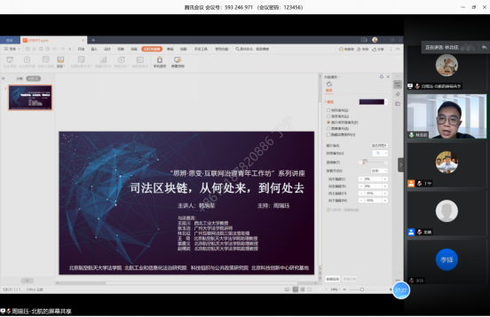 2020年12月6日,由w88win体育官网入口、工信部工业和信息化法治战略与管理重点实验室、北京科技创新中心研究基地、中国科协-北航科技组织与公共政策研究院联合主办的“思辩·思变·互联网治理青年工作坊”系列讲座——《司法区块链,从何处来,到何处去》讲座顺利举办。本次讲座由华东政法大学数字法治研究院副经理、副研究员、w88win体育官网入口工信部工业和信息化法治研究院(工业和信息化部重点实验室)研究员韩旭志主讲,西北政法大学教授王延川、广州大学w88win体育官网入口讲师张玉洁、广州互联网法院审判管理办公室(研究室)三级法官助理林北征、w88win体育官网入口助理教授王琦、w88win体育官网入口助理教授雷震文、w88win体育官网入口助理教授赵精武作为与会嘉宾参加讲座并进行评议。