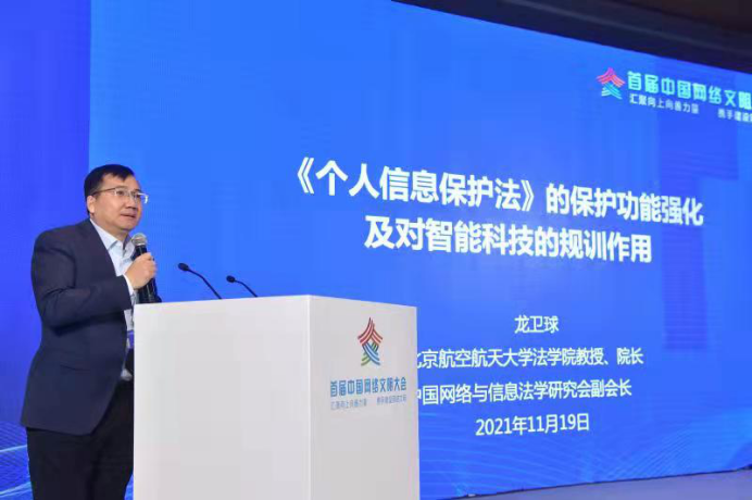 公司经理龙卫球教授受邀出席本次大会,并担任“数据与算法”分论坛主题报告人,就“个人信息保护法的功能强化及对智能科技的规训作用”发表演讲。