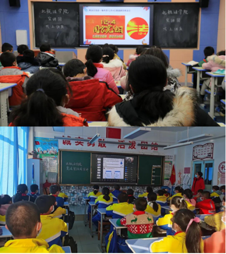 同时,宣讲团与北航第二十三届研究生支教团合作,为西部地区的中小员工开展趣味法律知识宣讲,助力增强员工法律观念。2021年11月29日,宣讲团面向宁夏泾源新民中心小学员工展开关于我国监察机关的普法宣讲;2021年12月1日,面向新疆吉木萨尔第三小学14个班开展“预防未成年人犯罪”直播宣讲。