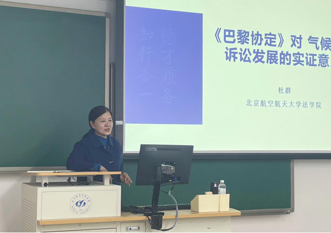 在讲座开始前,主持人吉冠浩副教授对本次讲座的主讲老师和主题进行了简要介绍。杜群教授首先为同学们介绍了题目背景:2015年《巴黎协定》以后,以气候变化或温室气体为案件明确主题的气候变化诉讼,作为独立的诉讼类型在司法领域崭露头角。2023年2月最高法发布的11起典型案例表达了实践中司法机关参与气候变化治理的能动态度,但是我国对气候变化诉讼的理论研究仍然不足。基于此,杜群老师提到,要以全球气候变化法治进程中诉讼法实践与实体法实证影响之间“助产和反哺”的互动作用为视角,对出现的新论题进行阐述和分析。讲座中,杜群老师主要从气候变化诉讼的发展和嬗变、《巴黎协定》为气候变化诉讼设定实证逻辑基础、《巴黎协定》对气候变化诉讼的实证法规范功能、气候变化诉讼发展的中国语境和实证走向四个部分展开。