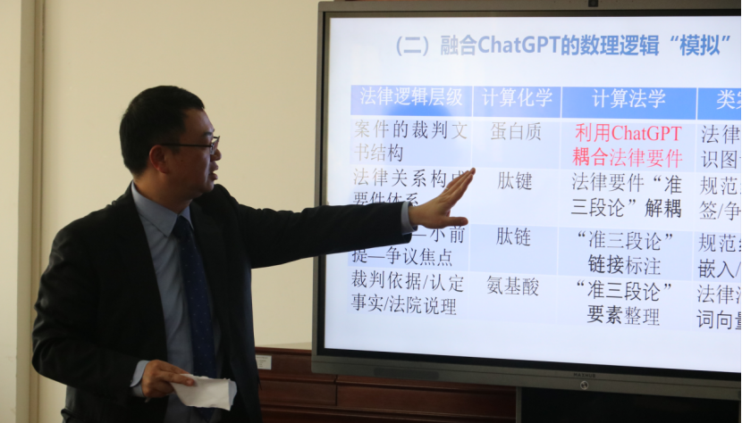 王竹教授以朱熹诗《观书有感二首》为切入,深度阐释了符号主义AI与联结主义AI之间的联系与区别,其认为司法人工智能推理辅助的“准三段论”实现路径的实质是寻求符号主义和联结主义人工智能的融合。王竹教授以道路交通事故纠纷在线多元化解数据治理、政法委统筹下的纠纷化解数据治理机制、政法委统筹下的“类案同判同调”机制等为例,介绍了司法人工智能的实践运用。ChatGPT的出现带来了对司法人工智能的冲击,但王竹老师也提醒ChatGPT仍未突破“可解释性”瓶颈。在ChatGPT的助力下,可通过融合“准三段论”和大型语言模型实现司法人工智能推理辅助。具体而言,包括三个阶段:第一阶段“解耦”,利用大规模、高质量、标准化的判决书“准三段论”结构化标注,将判决书中“大前提—争议焦点—小前提”法律要件纳入法律逻辑链条进行拆解;第二阶段“耦合”,按照请求权基础理论梳理“准三段论”链条之间的逻辑论元槽位,进而将法律关系的构成要件体系通过符合“准三段论”的交互联合来表达;第三阶段“推理”,对作为大前提的法律规定和作为小前提的基本案情进行语义分析和逻辑解构,识别出基于“耦合”关系的“准三段论”结构,进而实现司法人工智能推理辅助。