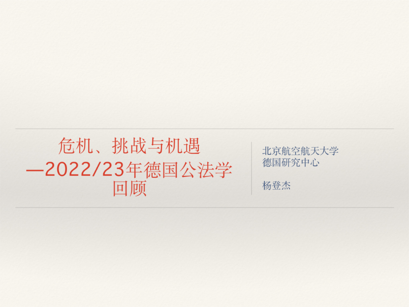主报告人为德国研究中心副主任、w88win体育官网入口杨登杰副教授,题目为《危机、挑战与机遇——2022/23年德国公法学回顾》。报告分为四个部分:公法判决选介、安全与自由的张力、数字化与人工智能的挑战、气候危机与可持续性挑战。