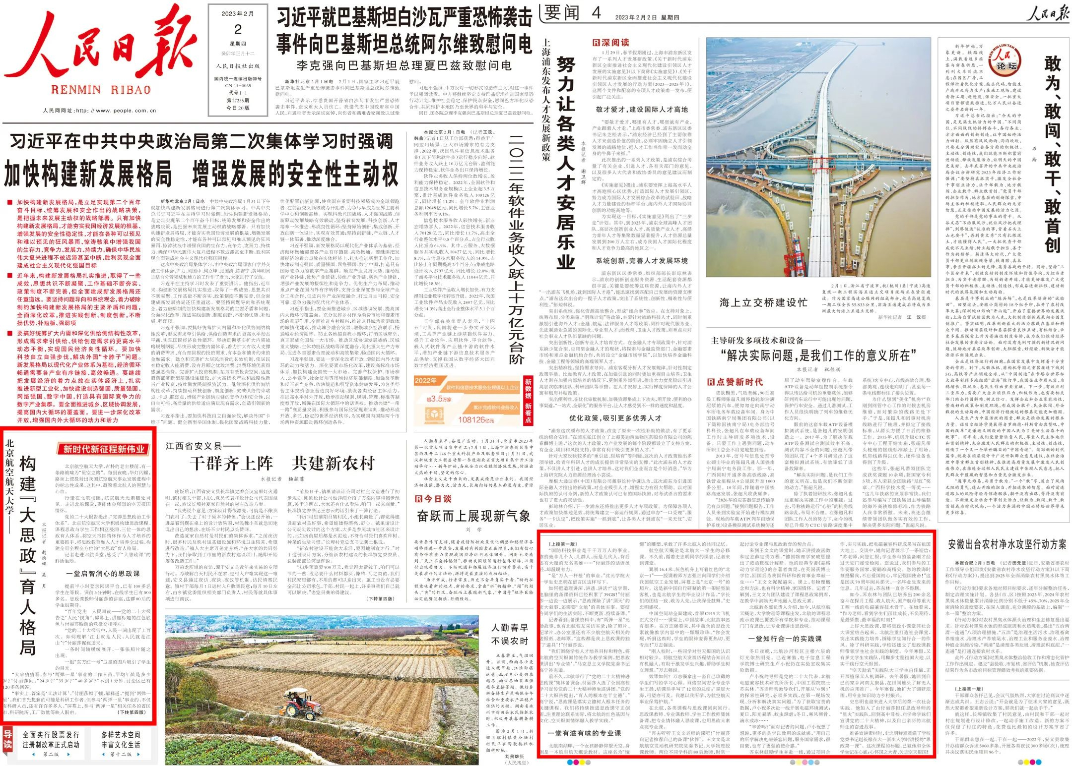 要扎实推进思政课程与课程思政协同育人,就要将思政教育与学科特色、专业特色、课程特色等深度融合,将科研、教学、人才、事件等蕴含的思政元素动态融入专业课程教学。自2020年秋季学期试点开设《习近平新时代中国特色社会主义思想概论》课以来,公司探索将以“空天报国”为内核的北航精神融入课程教学,设置了“科技创新与强国使命”专题,邀请院士团队参与授课。“太震撼了!”北航知行书院员工李骄娴表示,“这样的思政课完全超出了我的预期。”这样的教学改革表明,专业课中的思政元素不仅可以为专业课所用,也可以成为思政课的鲜活素材。公司持续加大课程思政建设投入,深化课程思政与一流课程一体化建设,先后打造136门校级课程思政示范课,实现公司全覆盖,出版《w88win体育官网入口课程思政优秀案例汇编(航空航天篇)》,提升教师课程思政建设能力,使课程思政元素成为专业教学的兴奋点和创新点。相关做法两次获《中国教育报》头版头条报道,2023年2月获《人民日报》头版报道。