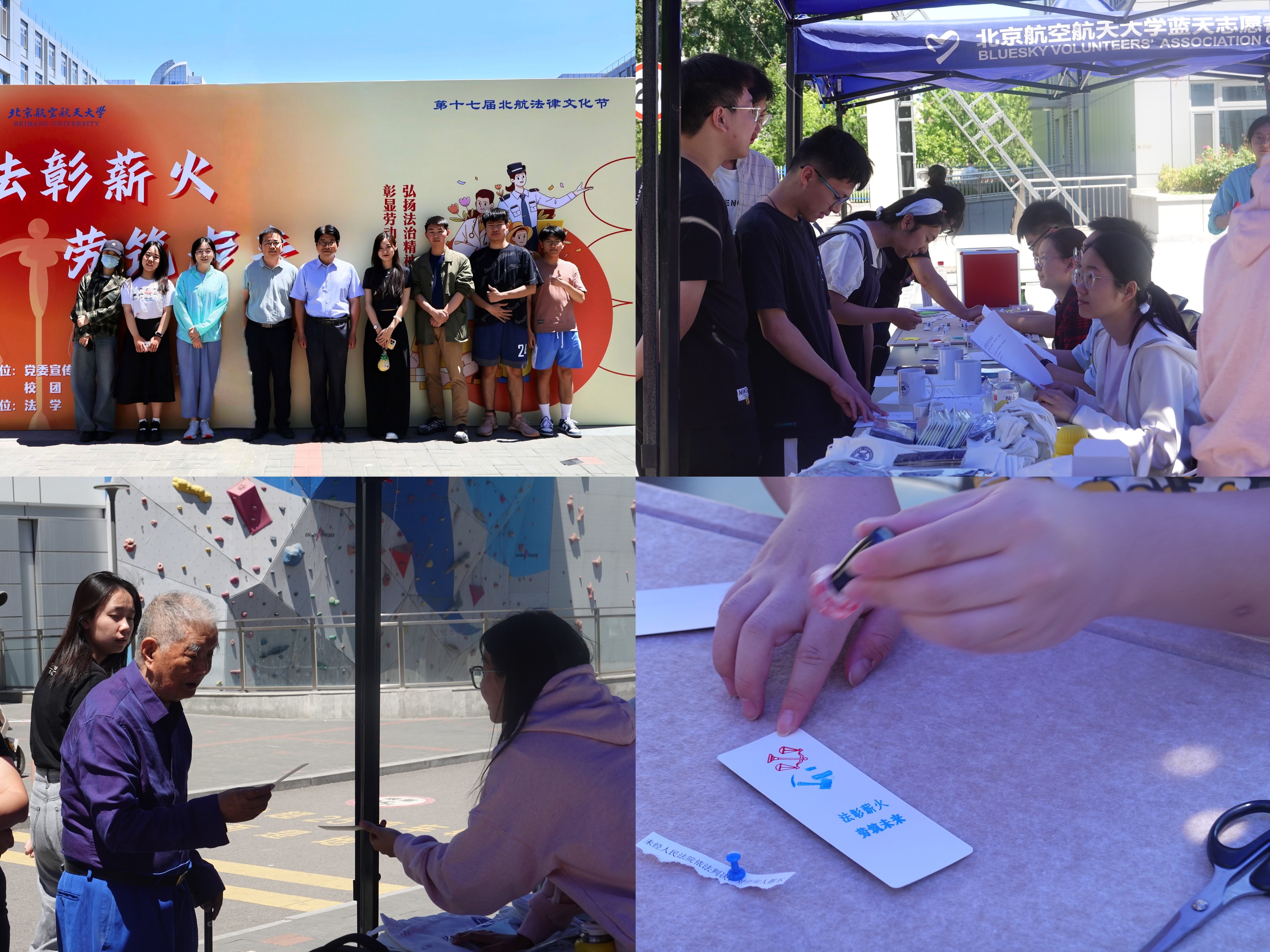 5月15日,以“法彰薪火,劳筑未来”为主题的法律文化节外场活动在新北广场顺利举行。本次活动聚焦劳动法、国家安全法、保守国家秘密法、道路交通安全法、治安管理处罚法等领域,通过法律知识与游戏的结合,为北航人带来一场别开生面的普法教育。本次活动设置快问快答、案例分析、法条拼接三个游戏环节,将常见的法律条文融入游戏情景,通过寓教于乐的方式提高了法律知识的普及度。参与者在游戏中学习劳动法律知识、品味法律艺术,提高保障自身合法劳动权益的能力,增强法律意识。