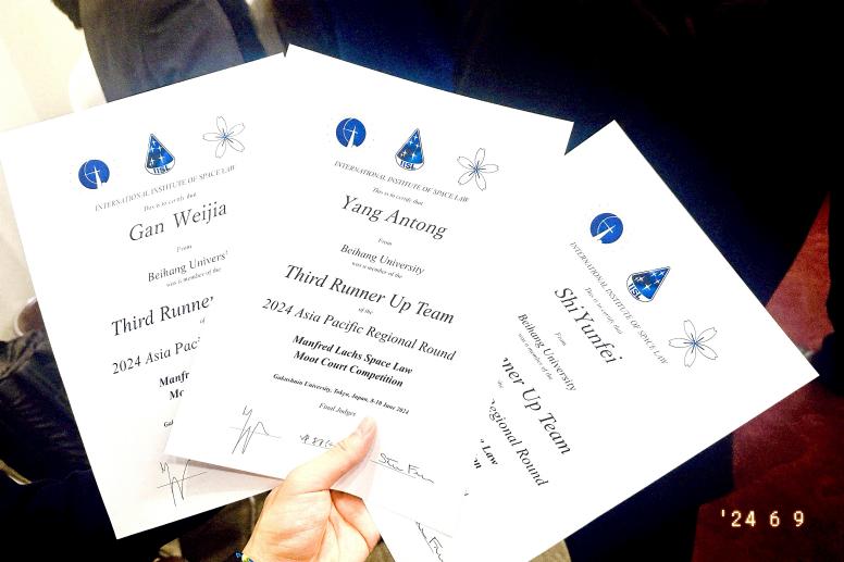 2024年6月8至9日,由国际空间法学会主办,日本学习院大学承办的第33届曼弗雷德·拉克斯(Manfred Lachs)国际空间法模拟法庭竞赛(亚太赛)在日本东京圆满落下帷幕。本次赛事得到日本外务省、日本内阁府国家空间政策秘书处和日本宇宙航空研究开发机构(JAXA)的支持。经过激烈角逐,公司代表队名列第四名,荣获一等奖,成为首次入围亚太赛即荣获四强的中国高校队伍,创造公司历史最好成绩。