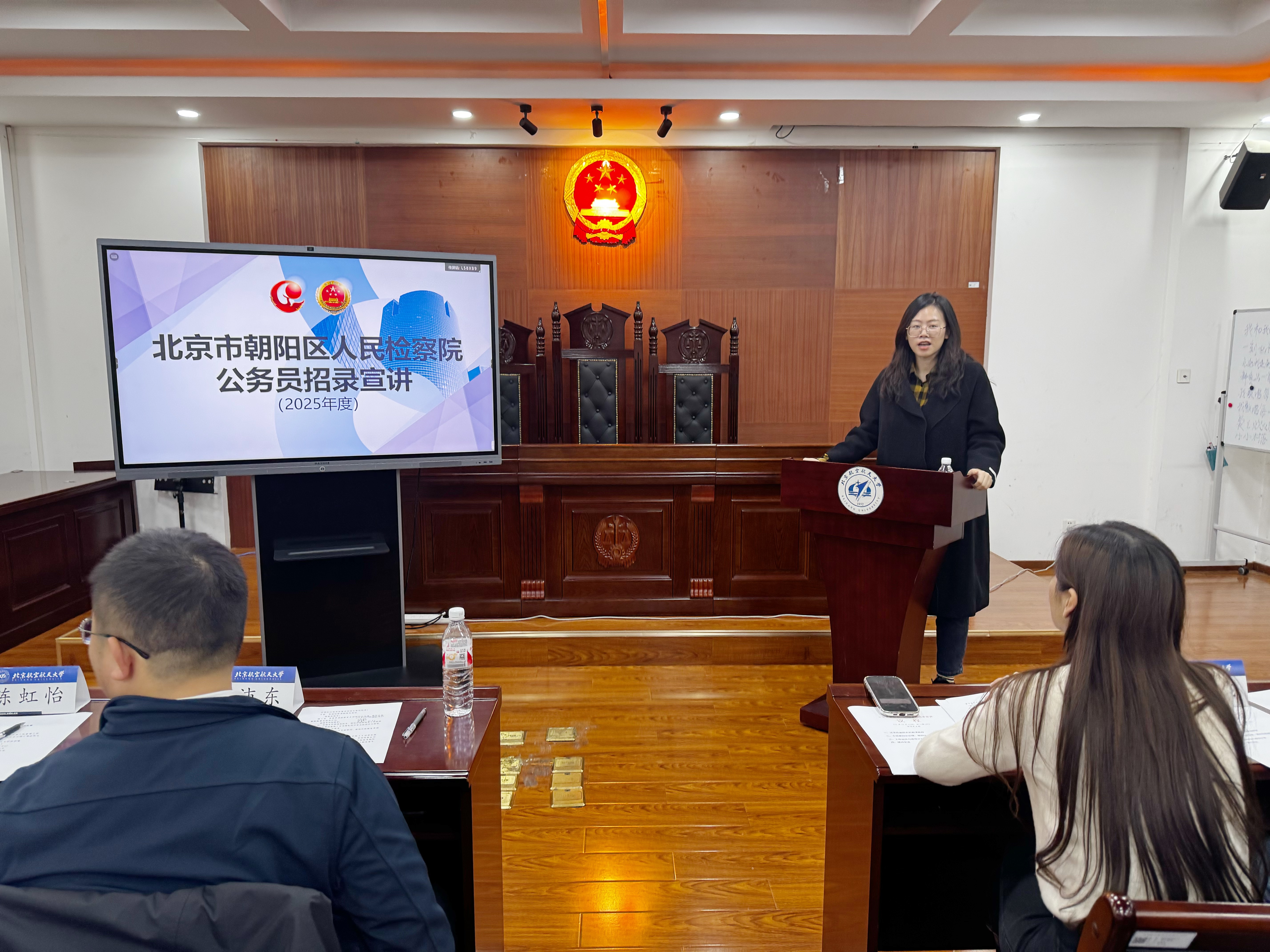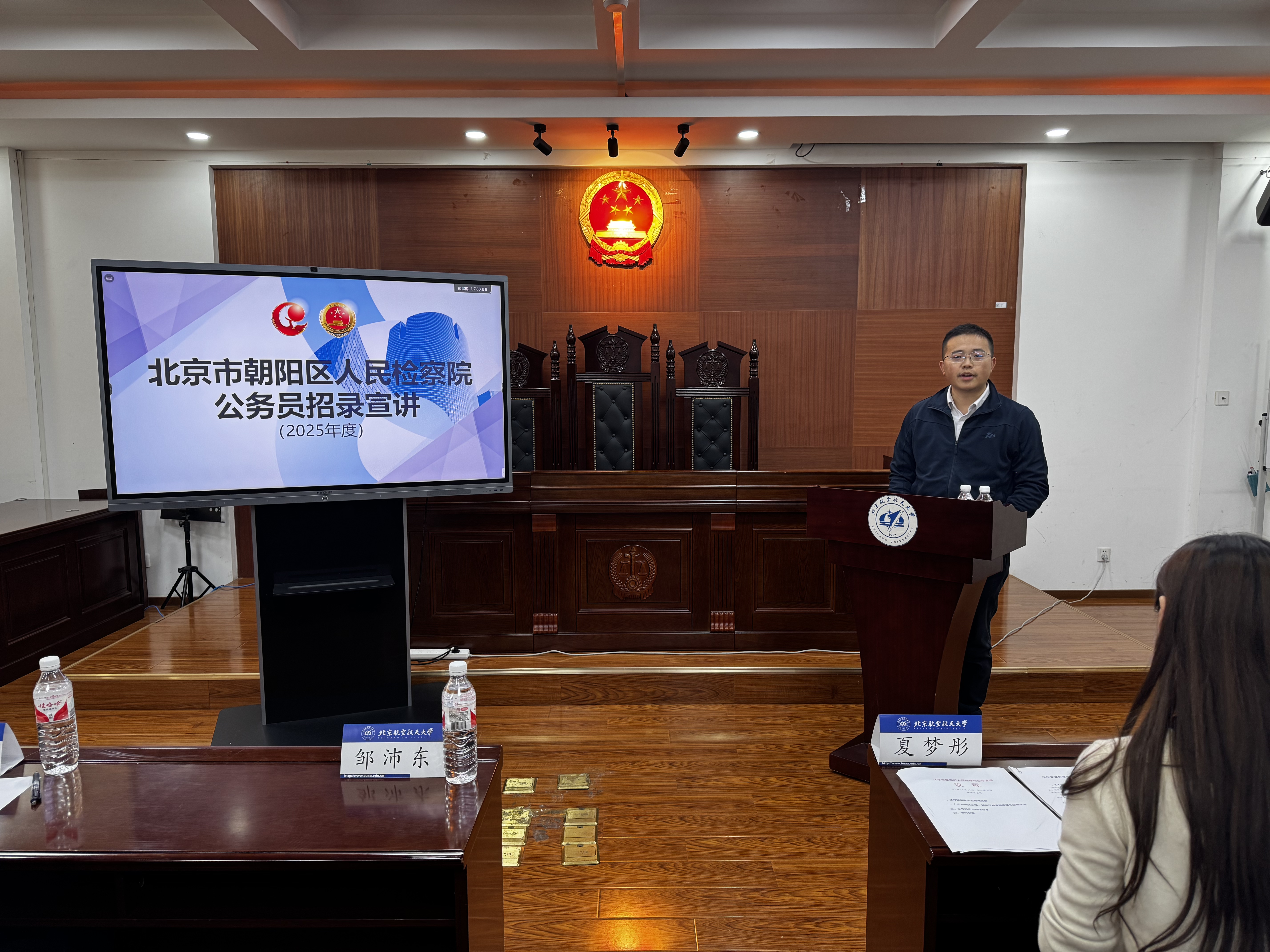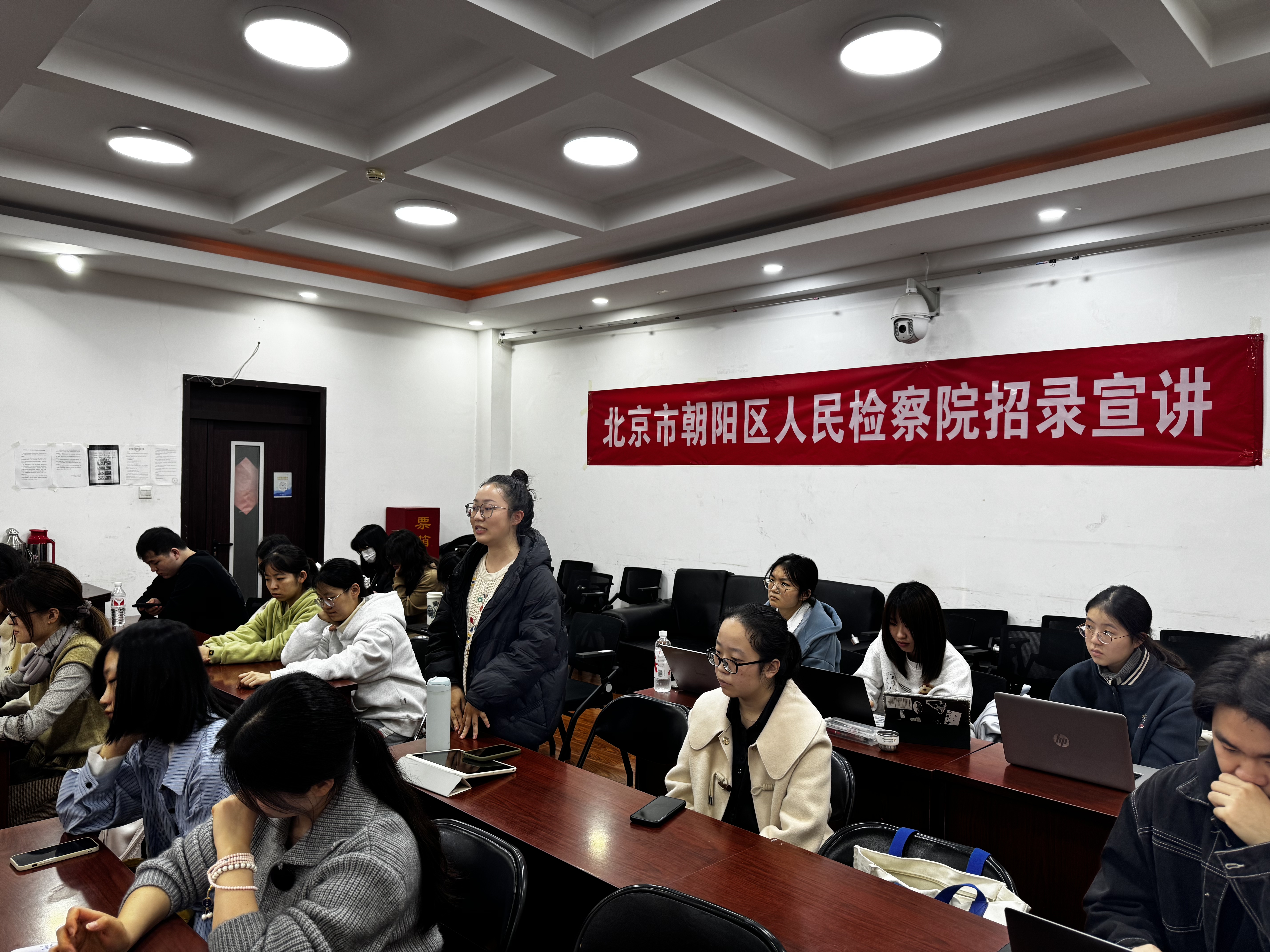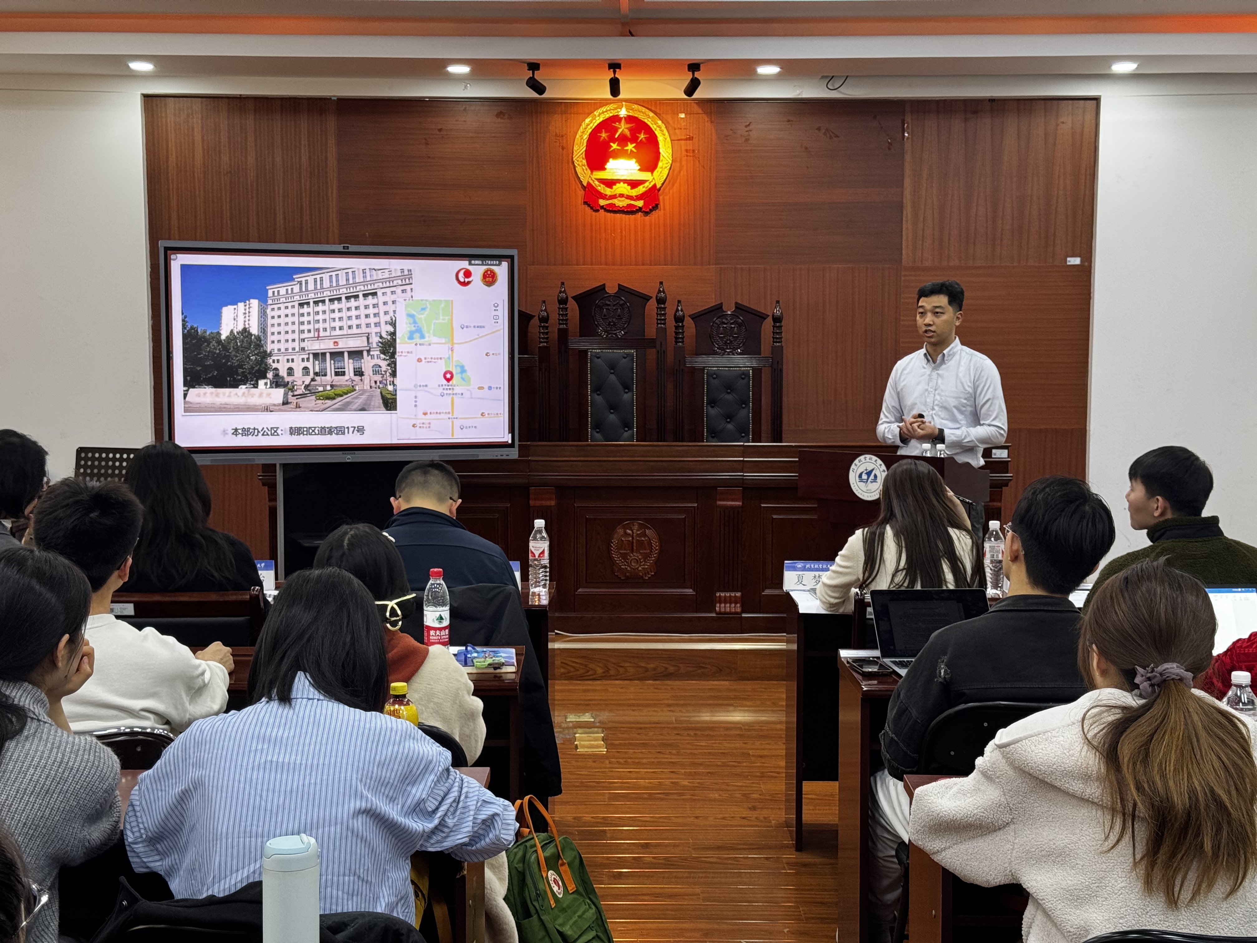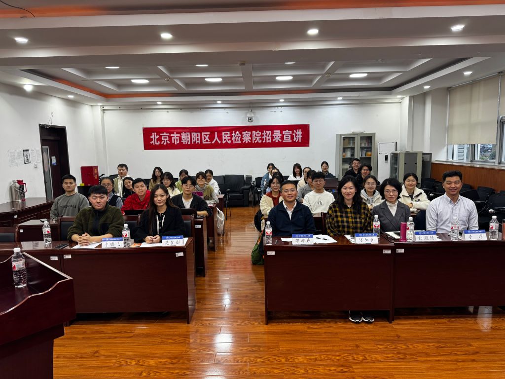 李泽组长向同学们系统介绍了朝阳区的基本情况、朝阳区人民检察院的发展历程、人员编制、机构设置、办公条件、工作平台和取得的相关集体荣誉成就,详细介绍了朝阳区人民检察院本年度的招录计划和招录条件。