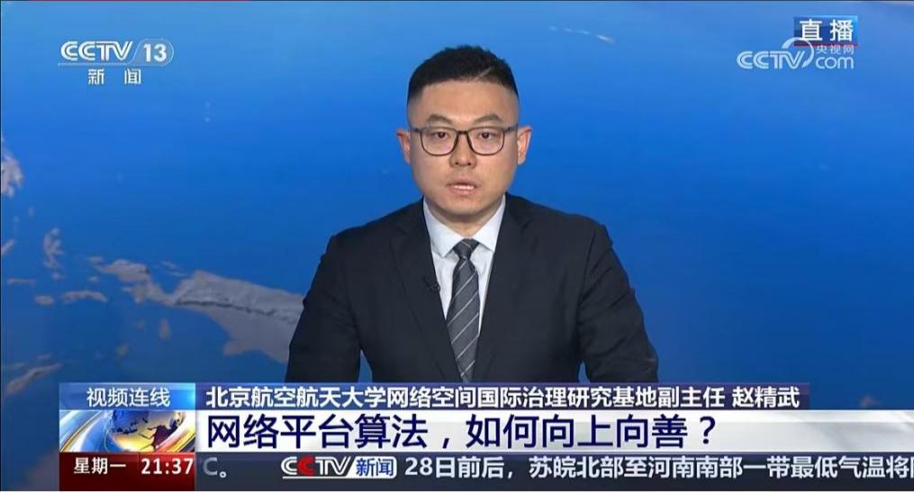 w88win体育官网入口网络空间国际治理研究基地副主任、w88win体育官网入口副教授赵精武于近日多次接受中央电视台专访,围绕网络暴力治理、网络平台算法典型问题治理与网络平台算法向上向善治理等热点议题发表观点。