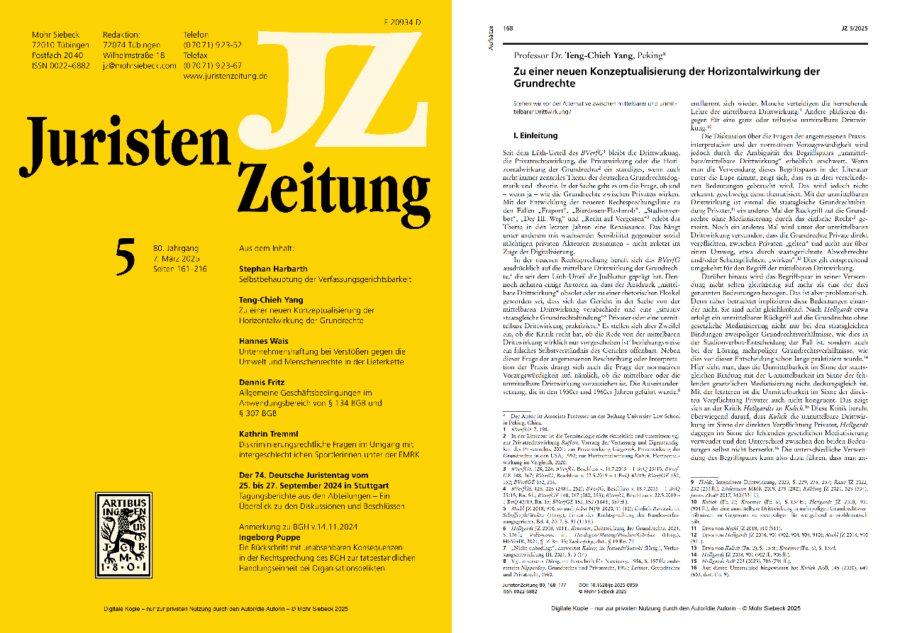 近日,公司杨登杰副教授在德国顶级法律学术期刊《法学家报》(Juristenzeitung, JZ)2025年第5期发表德文论文Zu einer neuen Konzeptualisierung der Horizontalwirkung der Grundrechte(《基本权利水平效力的概念重构》)。