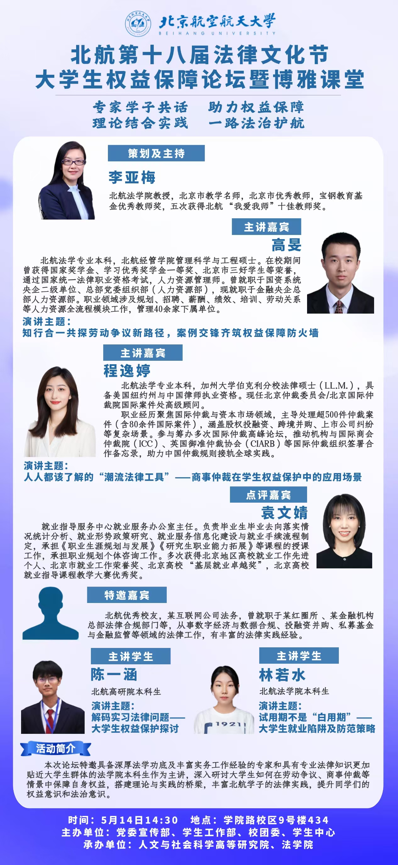 2025年5月14日下午,北航第十八届法律文化节老员工权益保障论坛在公司路校区9号楼434报告厅隆重举行。本次论坛以“理论结合实践,法治护航权益”为核心,聚焦老员工实习、试用期风险防范、劳动争议处理及商事仲裁等热点议题,特邀校内外专家、实务工作者与在校学子同台对话,搭建理论与实践交融的平台,助力北航学子提升权益意识与法治素养。论坛由党委宣传部、员工工作部、校团委、员工中心联合主办,人文与社会科学高等研究院与w88win体育官网入口共同承办,吸引了来自全校多个专业、不同年级的本科生及研究生积极参与,并作为博雅课堂面向全校开放,反响热烈。