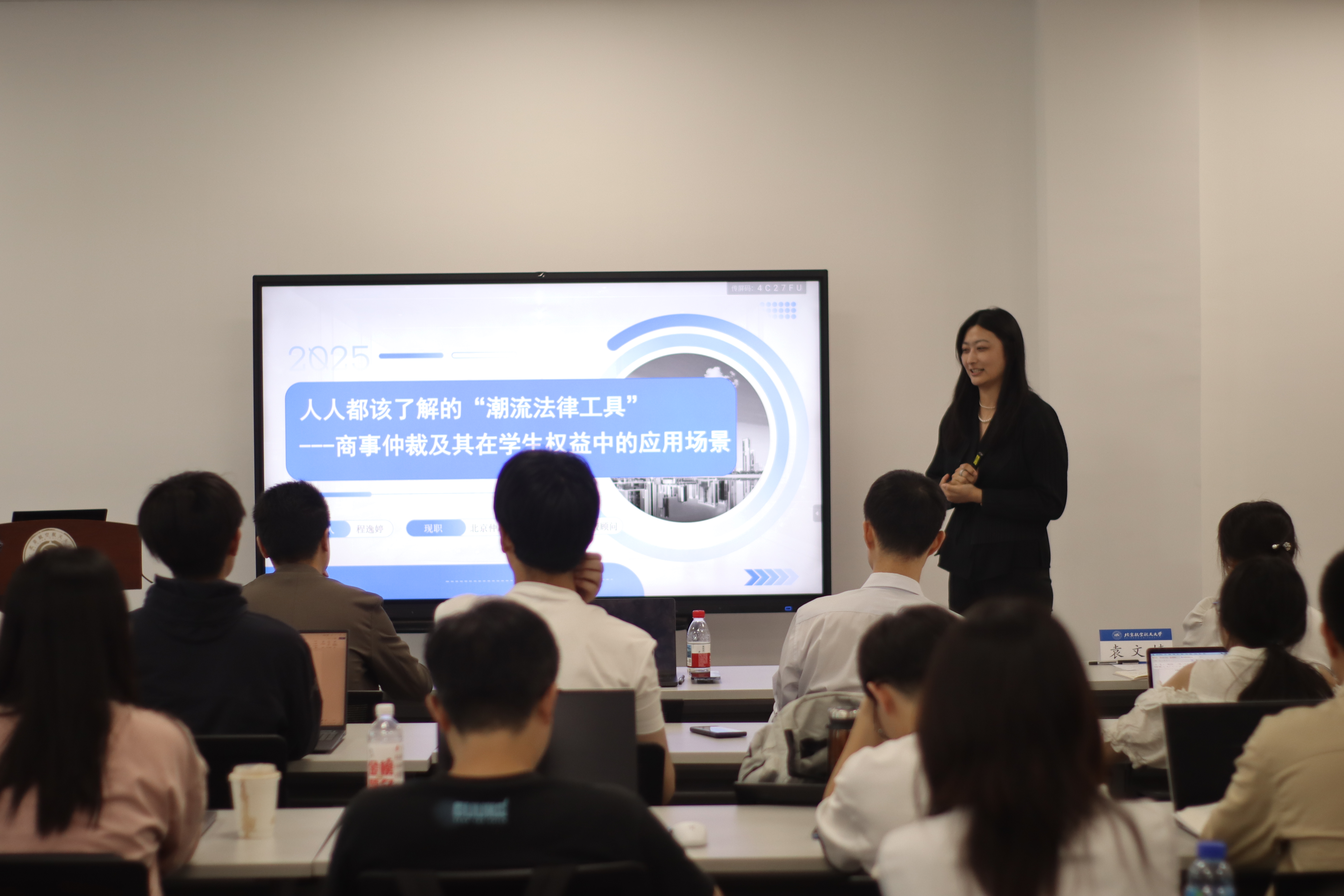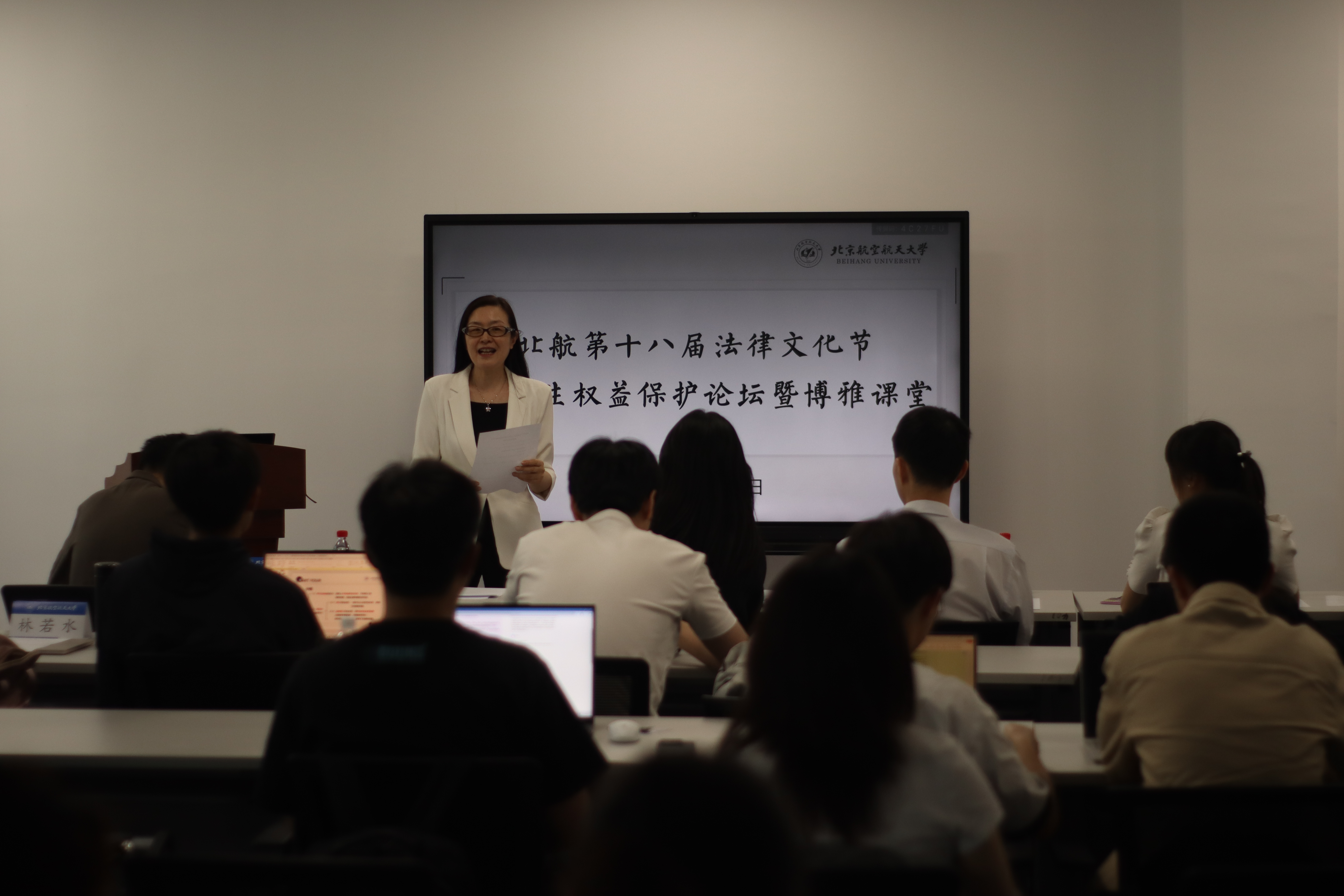 随后,北航校团委副书记高文琪致开讲辞。她指出,五四青年节刚过,青年学子更需以法治思维武装自我,在新时代扛起维护权益的旗帜。“法治中国这个宏图,需要有人运筹帷幄,也需要有人躬身耕耘去播种法治的种子。”高文琪副书记寄语青年学子,鼓励大家在实践中深化对习近平法治思想的理解,争做新时代法治建设的生力军。