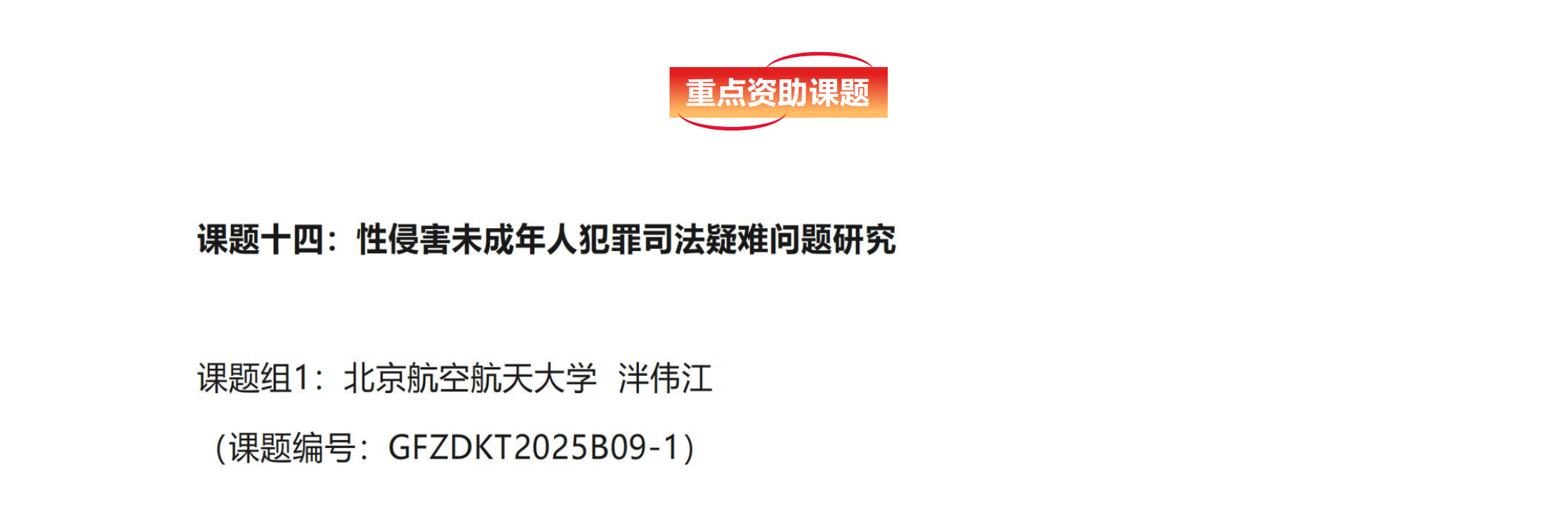近日,最高人民法院2025年度司法研究重大课题立项结果正式公布。w88win体育官网入口经理、少年司法研究基地执行主任泮伟江教授作为主持人申报的课题“性侵害未成年人犯罪司法疑难问题研究”获得重点资助课题立项。