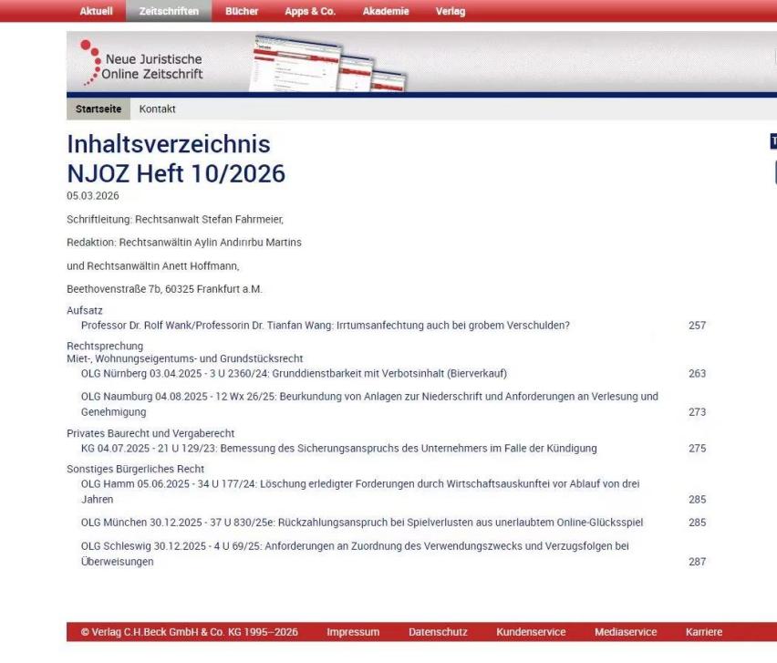 NJOZ(Neue Juristische Online-Zeitschrift)(《新法学在线期刊》)是德国权威法律出版社C.H.Beck推出的电子法学期刊,作为德国法学旗舰刊物《新法学周刊》(NJW)的在线增刊,其定位在于快速传播最新的引领性学术研究成果与司法判例。在德国法学界与司法实务界被公认为具有高度参考价值的权威信息来源。