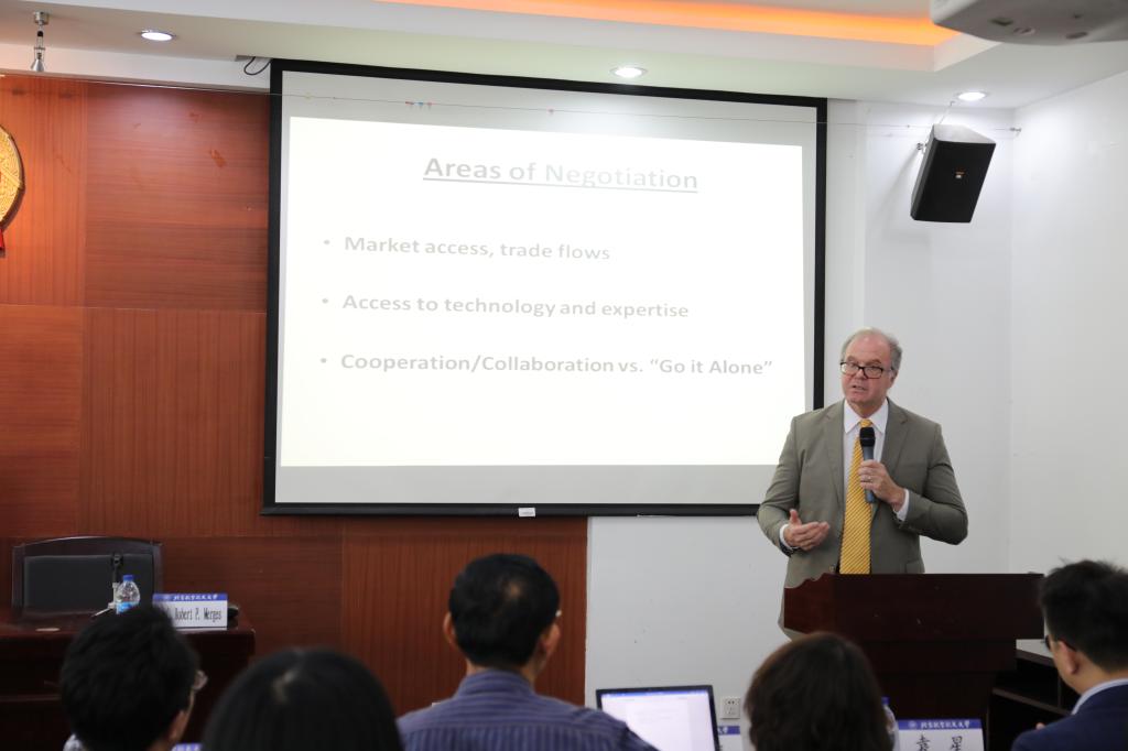 讲座中,Merges教授分别就中美经济关系的未来,跨国知识产权的现状,以及知识产权在新型中美关系中的角色定位等主题展开演讲。Merges教授通过详实的数据指出中美贸易与投资多年来整体呈现增长的趋势,我们应当维护现有的跨国知识产权体系,如PCT申请、WTO机制的继续运行。知识产权的灵活运用能够为贸易纠纷的解决提供非常好的模型。中美应当尽量缩小存在摩擦的领域,运用已经确立并运行多年的跨国知识产权纠纷解决机制中立客观的解决贸易与知识产权纠纷。