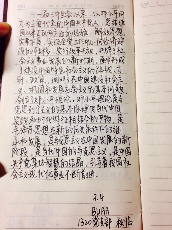 党章全文共一万五千多字,每天平均抄150字左右,计划100天抄完。1320党支部还依托本支部的党建学习微信平台,发动入党积极分子、干部群众一起分享心得、互相促进;并结合《人民日报》“学习小组”微信平台的互动,将每天抄写的内容,用手机拍照上传,与更多党员一起学习交流。