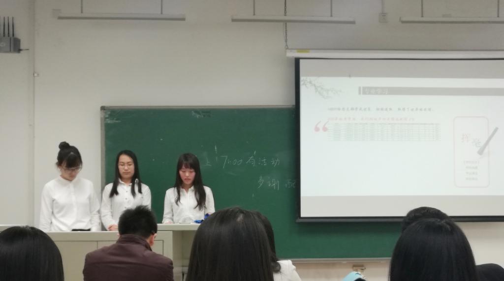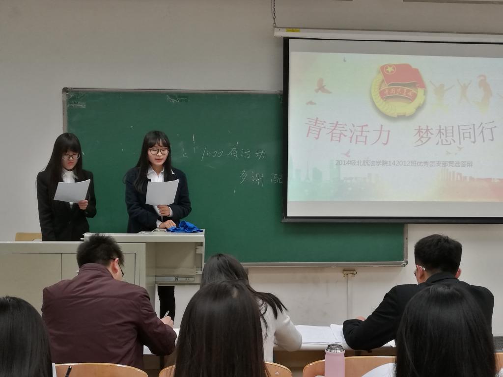 简单开场后,优秀团支部的答辩正式开始。142011团支部由李天琦、张雅昕、马臻玮三名女生组成,从学习成绩到集体活动多方面展示了团支部,还通过录制视频让每位团员表达自己的感受,现场气氛活跃,充分体现了团支部的凝聚力。142013团支部则是由陈峰、李洋、伍迪阳三名男生组成,13团支部的学习氛围积极向上,他们创建的读书小组机制已具雏形,更是能在今后带领整个团支部共同进步。最后进行答辩的是142012团支部,由杜昱非、陈希同学作为代表,她们以社会主义核心价值体系为主线,从爱国、敬业、诚信、友善多个价值观角度展现了优良的班级风貌,丰富的荣誉和多彩的日常活动更是为12团支部增添不少风采。