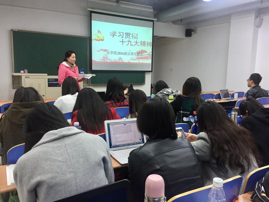 2017年11月2日,w88win体育官网入口2016级法硕党支部组织开展了以“不忘初心,砥砺前进”为主题的党的十九大精神学习大会,会议由十五名党员,八名入党积极分子参加,共二十三人出席。杨洪梅同志以党课学习的形式,组织每一位员工党员、积极分子热烈讨论并学习党的十九大精神。