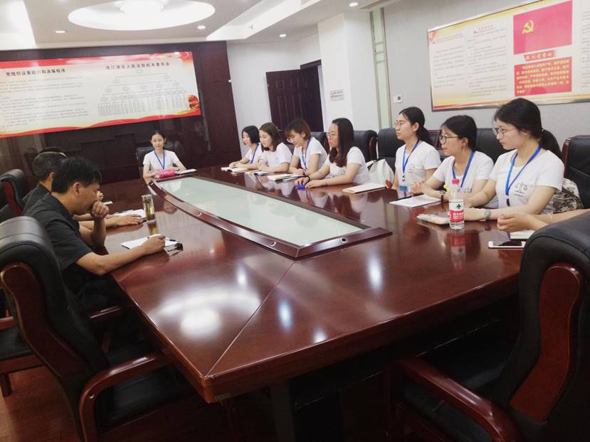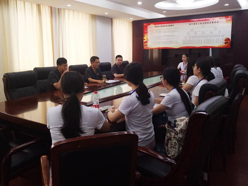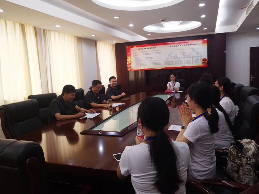 公司党组成员、政治处主任王炳连、人事科科长蒋兴忠以及蒋同一主任亲切地接待了同学们,并由王炳连主任主持召开了迎接座谈会。会上,王炳连主任对同学们的到来表示欢迎,首先介绍了淮安地区的风土人情,其后对法院概况也做了简要展示:淮安市清江浦区法院由淮安市清河法院和淮安市清浦法院合并而成,拥有二十余个部门,在编行政人员202名左右,还拥有一大批聘任制的书记员,总共350名左右,处理的案件多达两万多起,其中民商事案件较多。