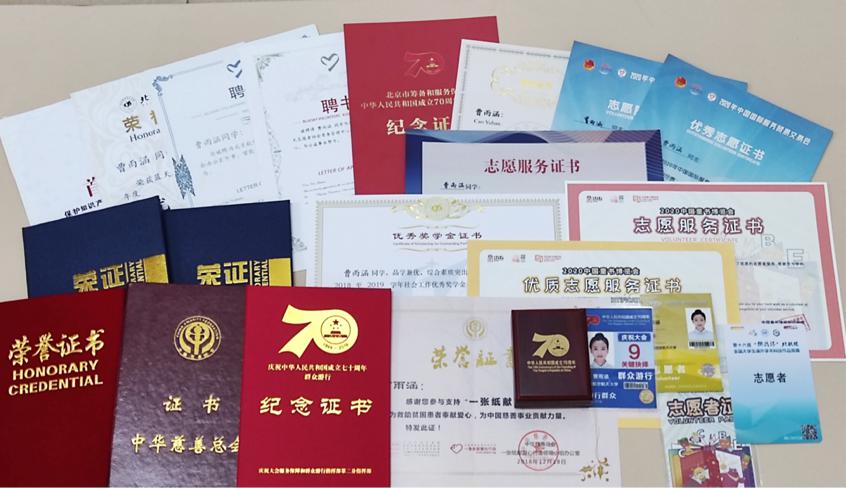 自大一入学起,曹雨涵即加入蓝天志愿者协会参与志愿工作,在一年多的志愿服务工作中,她积累了大量的经验,为多项校内外公共活动付出了青春的汗水。她曾参与“挑战杯”全国老员工课外学术科技竞赛、北航“强基计划”招生考试志愿服务,并在在疫情期间参与组织“手拉手”关怀抗议一线人员家属活动,组织志愿者为一线抗疫人员家中子女进行课业辅导;2020年9月参与中国国际服务贸易交易会志愿服务,担任组长及宣传骨干,协助负责人完成组织、联络及宣传工作,在工作中表现优异,获得“中国国际服务贸易交易会优秀志愿者”称号;在冬奥会志愿者报名通道开启后,曹雨涵第一时间响应报名,参与冬奥会骨干志愿者英语学习项目,积极准备服务北京冬奥。