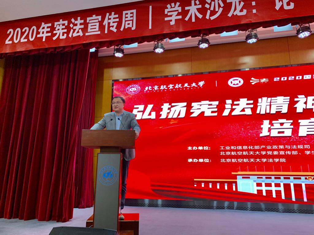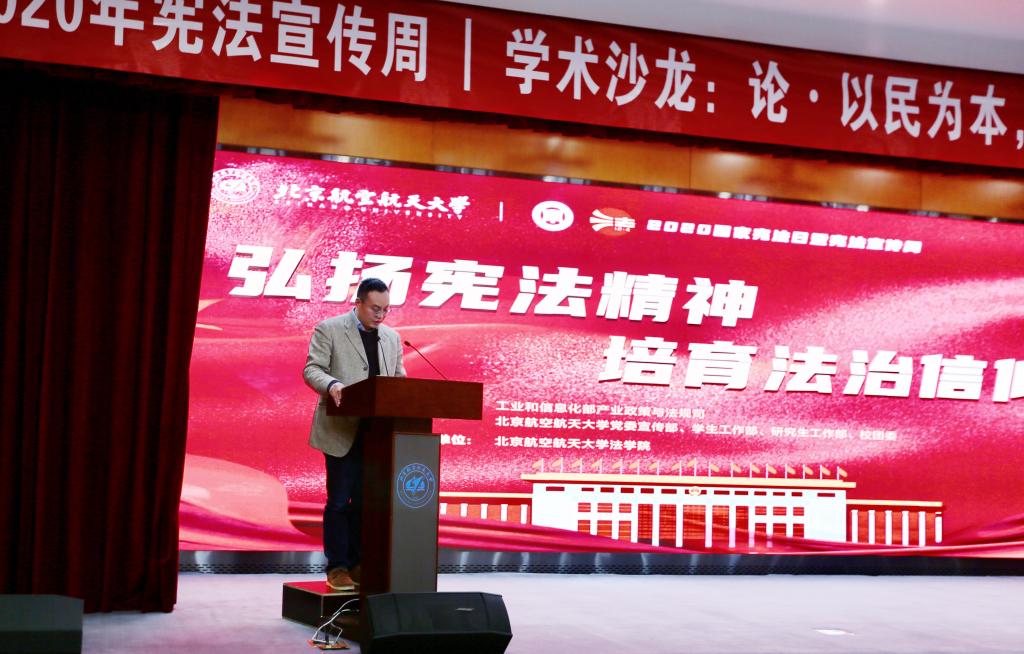 12月4日晚19:00-22:00 ,w88win体育官网入口举办的“以民为本,以法护航——宪法法律在身边”普法沙龙在北航公司路校区如心会议中心大报告厅举行,在腾讯会议与bilibili同步直播。工业和信息化部产业政策与法规司执法监督处处长石玉春和w88win体育官网入口党委书记王琪全分别致辞。w88win体育官网入口王锴教授、中国政法大学雷磊教授、中国人民大学朱虎教授和w88win体育官网入口周友军教授分别就与宪法相关的四个主题进行了交流与探讨。w88win体育官网入口党委副书记张渊、分团委书记邹沛东等出席此次活动。本次普法沙龙由w88win体育官网入口副经理泮伟江教授主持。