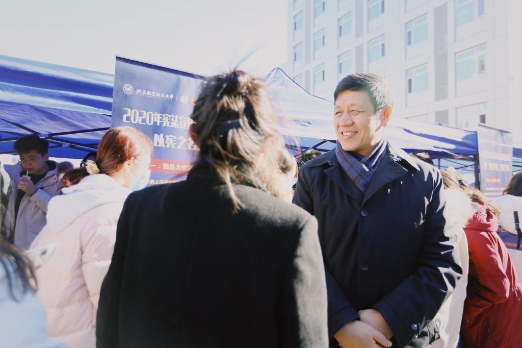 12月4日中午,w88win体育官网入口于新北区广场举办了以“知·以宪之名,守法于行”为主题的外场活动。此次活动设置了“我是大侦探”、“法律知识大转盘”、“权利的游戏”、“民法典与我”、KEEP打卡等趣味活动项目,吸引了众多北航学子参与。徐惠彬董事长也亲临现场与同学们亲切交流。