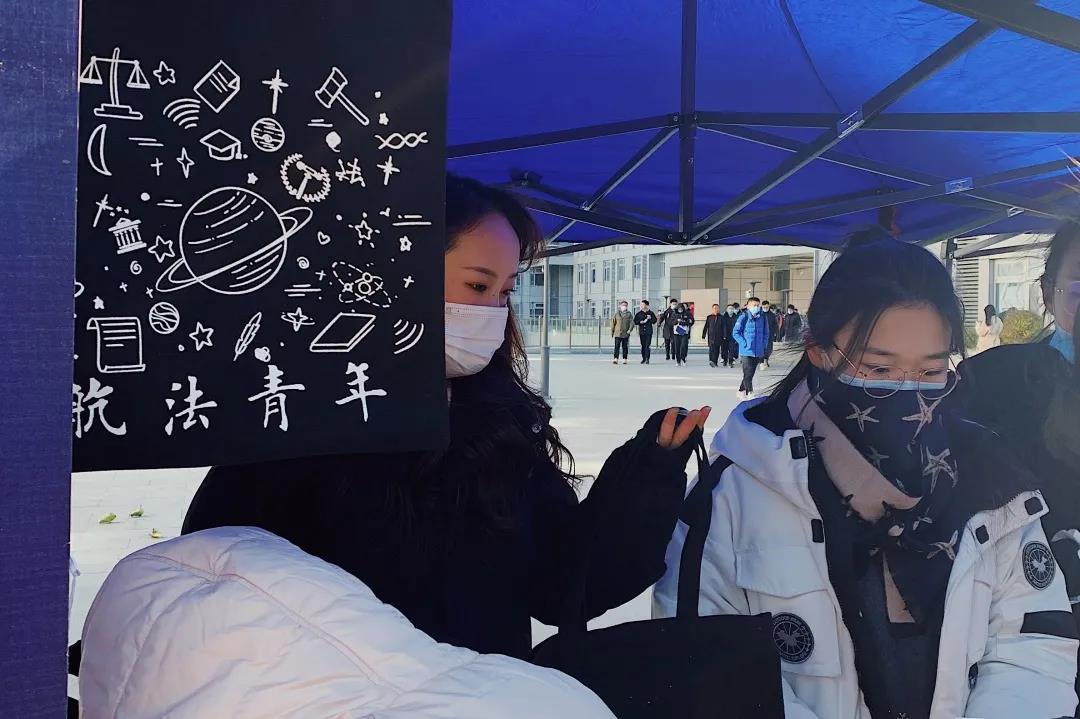 外场活动设置了与宪法法律相关的题目与案例场景。公民的基本权利有哪些?宪法的地位是什么?商场怀疑顾客偷东西而搜身是不是侵犯了人身自由?单位要求女性职工两年内不许怀孕是否侵犯了妇女的基本权利?在对这些问题的探索中,同学们既收获了精美的小礼品,又加深了对宪法法律知识的了解。红色封面的《中华人民共和国宪法》吸引了许多同学翻阅,定制的“航法青年”等文创产品也激发了同学们争先恐后答题的热情。