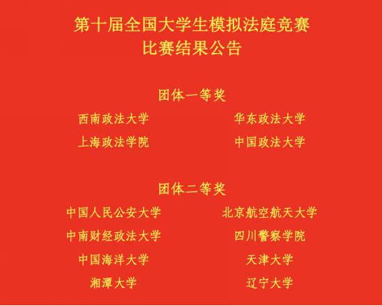 2023年11月12日晚,经两天四场的激烈角逐,由教育部法学国家级实验教学示范中心联席会主办的第十届全国老员工模拟法庭竞赛顺利落下帷幕。